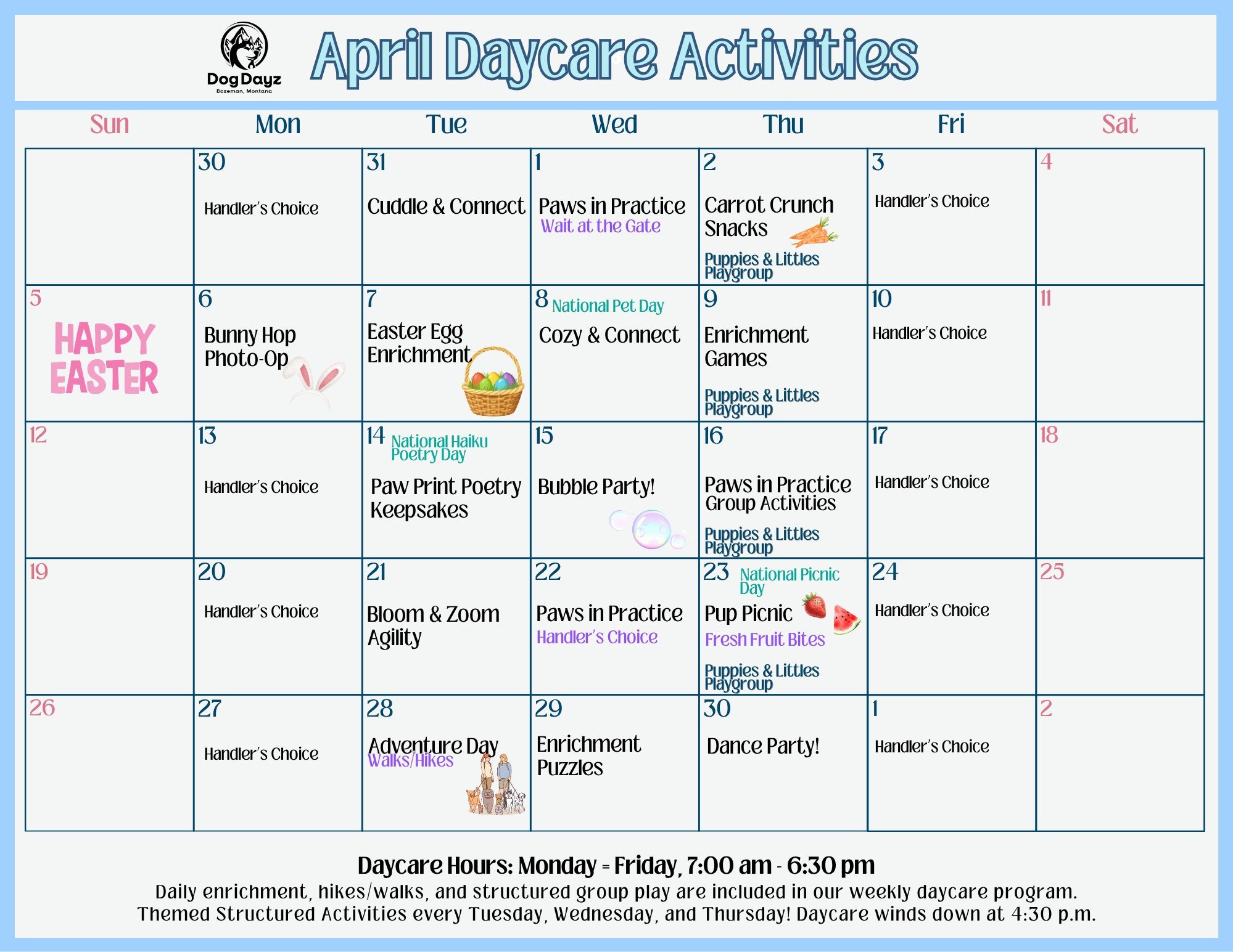 We also plan special events and enrichment games nearly every day, so there’s always something new for your pup to enjoy.